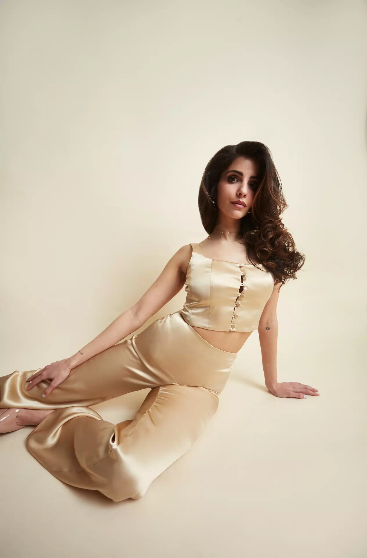 Fitted and cropped, ending just above the waist. Square neckline with thick straps and a row of covered buttons down the center. A chic and refined style, ideal for formal or polished outfits.