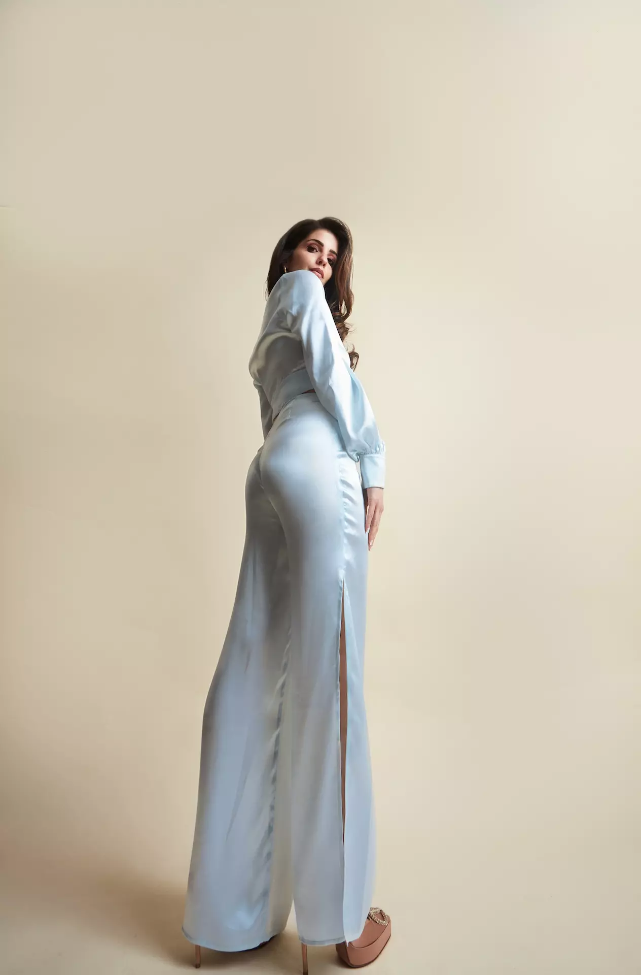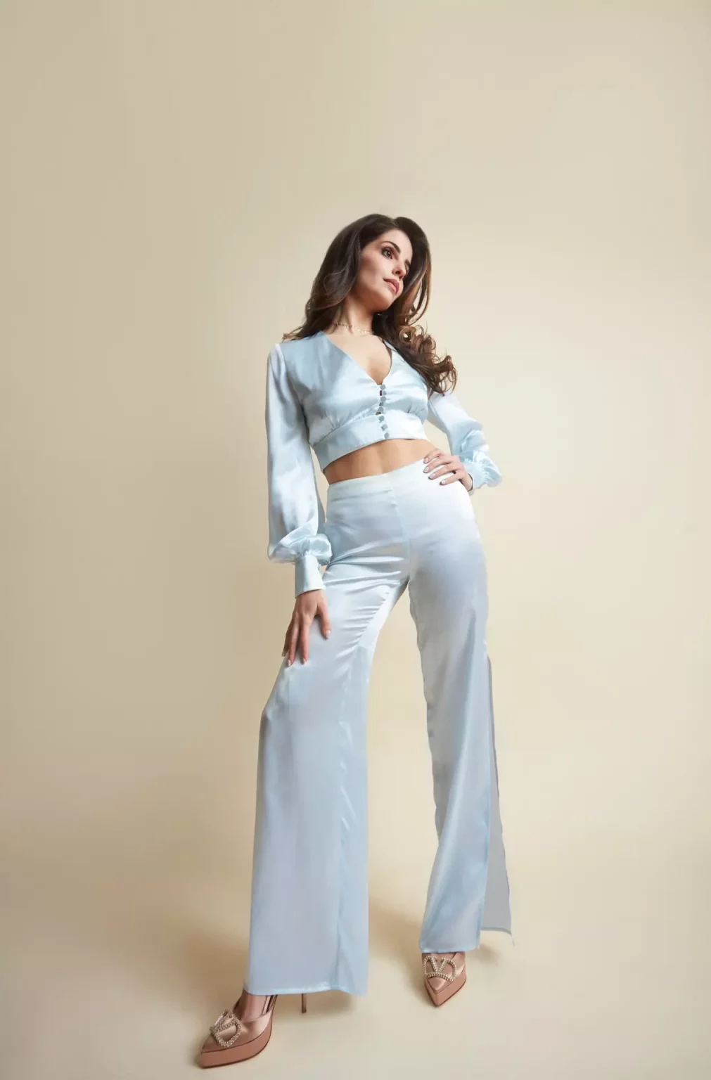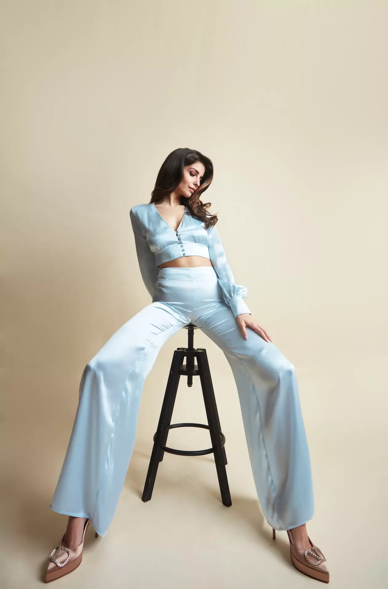 Coupe courte ( crop top) qui dévoile une partie de la taille. Décolleté profond en V, fermé par des boutons recouverts sur le devant. Manches longues avec un volume généreux, resserrées au niveau des poignets pour un effet bouffant élégant.