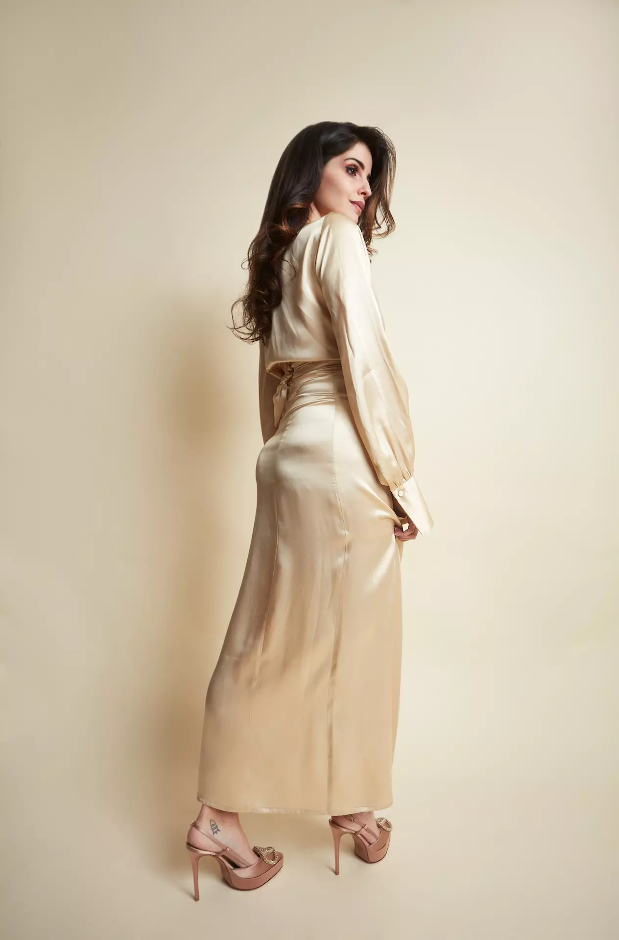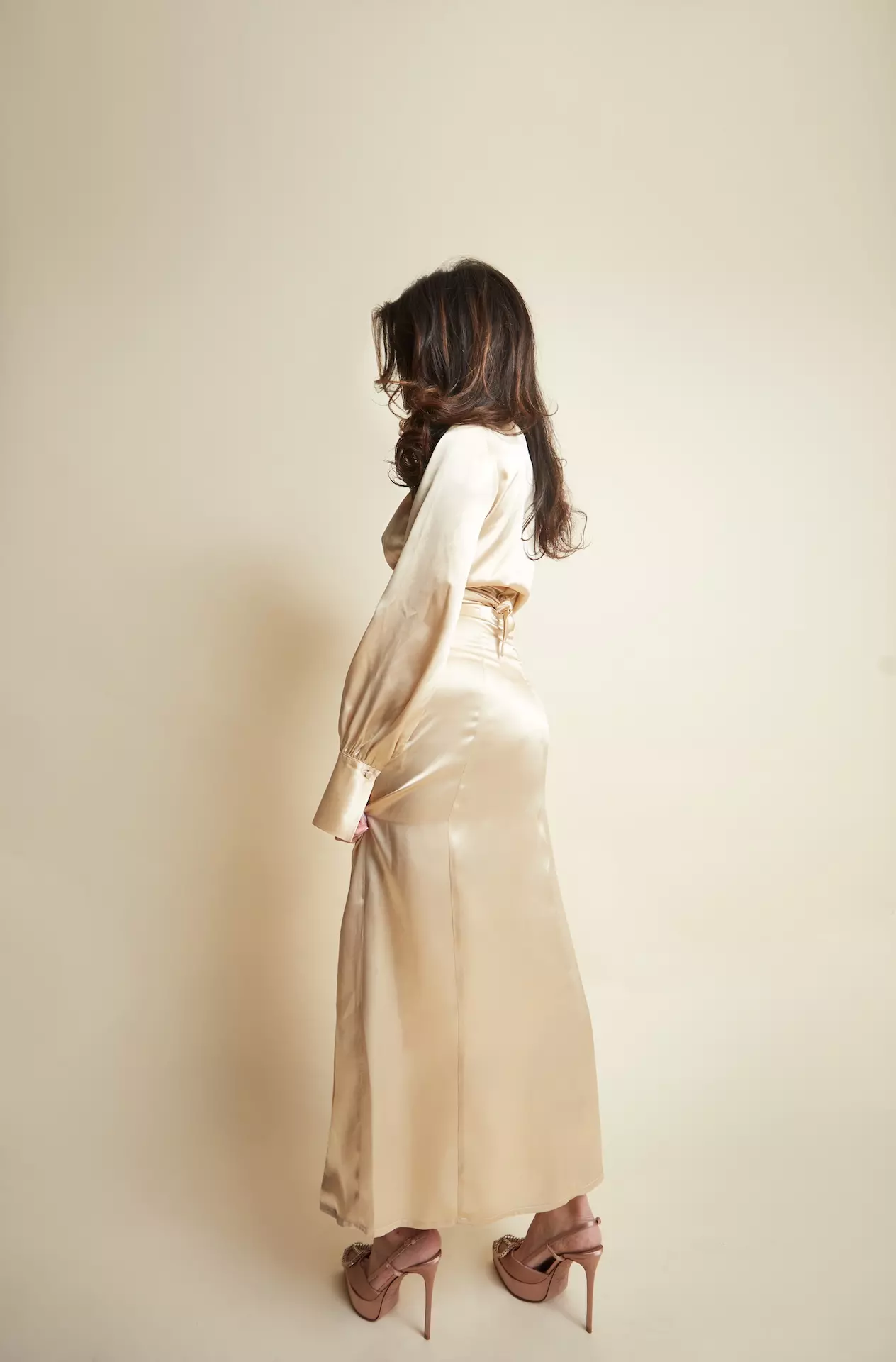 Cette jupe a une coupe longue et ajustée, soulignant la silhouette. Détail de boutons recouverts décoratifs sur le côté gauche, ajoutant une touche élégante et sophistiquée. Taille haute pour un effet allongeant. Elle se ferme à l’aide d’un zip.